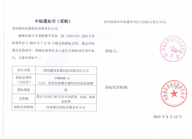 河南大學(xué)2015-962中標(biāo)通知書(shū)